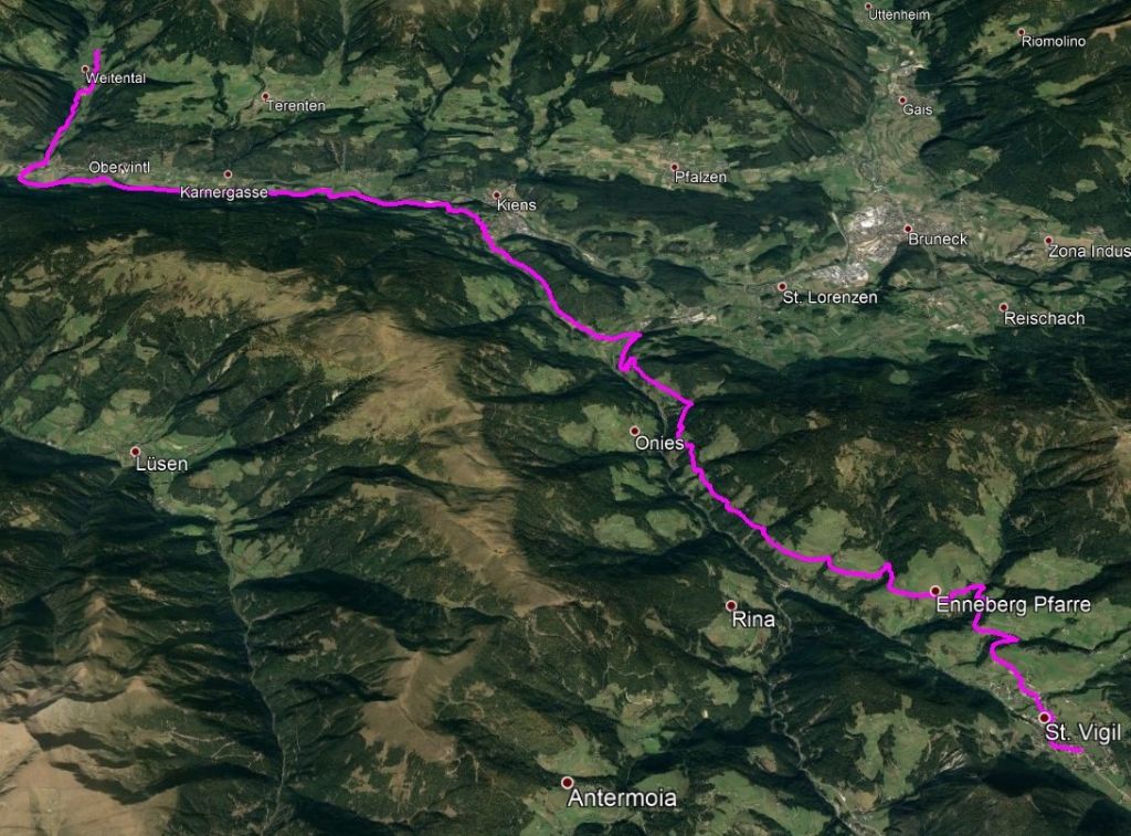 Wir fuhren Richtung Bruneck. Den Radweg kannten wir bereits, also fotografierte auch niemand. So ging es über Ehrenburg nach Maria Saalen, immer auf den Spuren unserer ersten Transalp 2010.