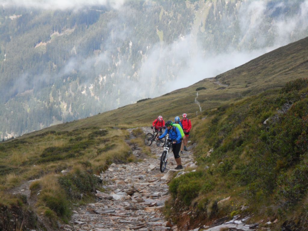 Wir starteten in Gries am Brenner. Alles andere hätte einen Tag zusätzlich gekostet. Zunächst waren wir zu sechst. Rainer würde aber nur die erste Etappe mitfahren. Trotzdem war sein Rucksack so prall und schwer als hätte er ebenfalls Ausrüstung für acht Etappen dabei. Wir vermuteten sportlichen Ehrgeiz dahinter. Während wir uns zunehmend auf die technischen Anforderungen der Abfahrten konzentrierten, war für ihn der Anstieg der Gegner, den es zu bezwingen galt. Seinen Erfolg wollte er dabei sicher nicht einem leichteren Rucksack zugeschrieben bekommen.