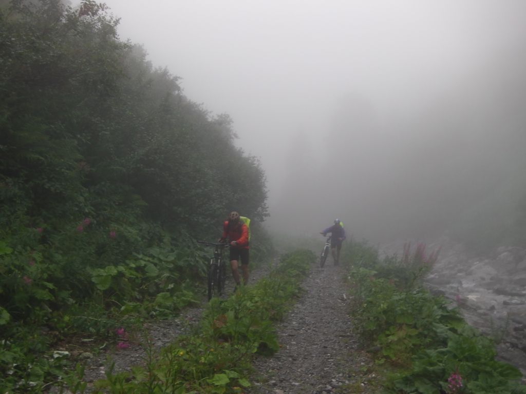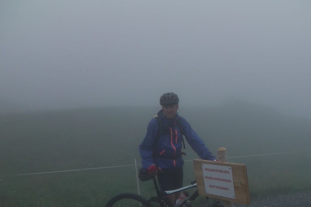 Die letzten 200 Höhenmeter zum höchsten Punkt des Tages, dem Spullersee, kann man getrost auf der wenig befahrenen Teerstraße zurücklegen. Für uns hatte das den Vorteil, dass wir rechtzeitig zum Regen dort oben ankamen. Gleichzeitig befanden wir uns auch in den Wolken, was die Frage aufwarf, wo der Regen überhaupt herkam.