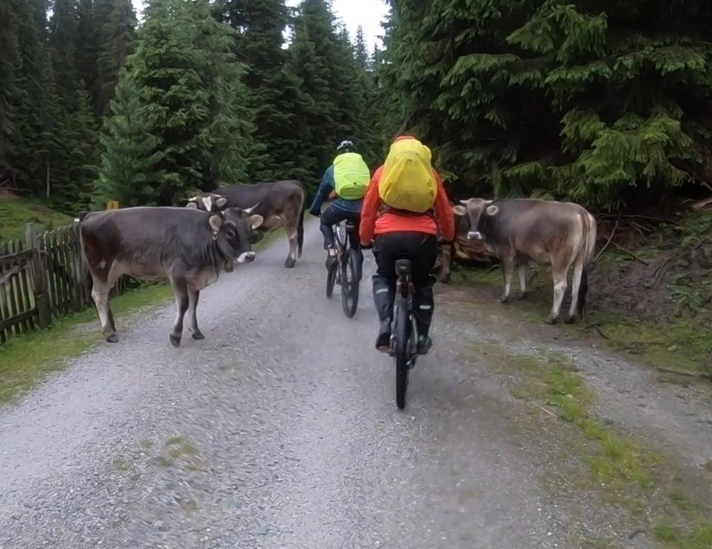 2017 gab es neben dem Höhenunterschied noch das Hindernis des „bösen Bauern“, der die durch eine Radsperre geschützte Zone unterhalb der Sattelalm konsequent verteidigte. Damals haben wir den ausgeschilderten mühsamen Umweg genommen.