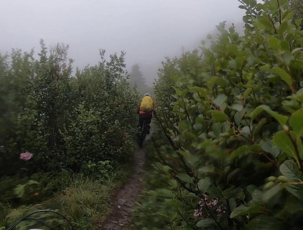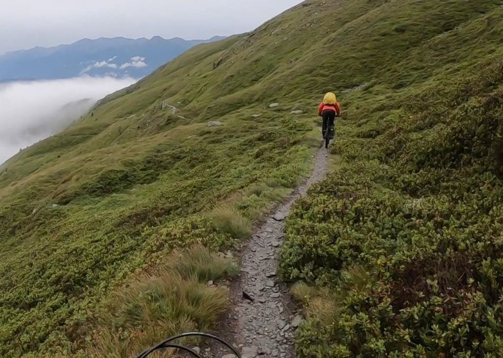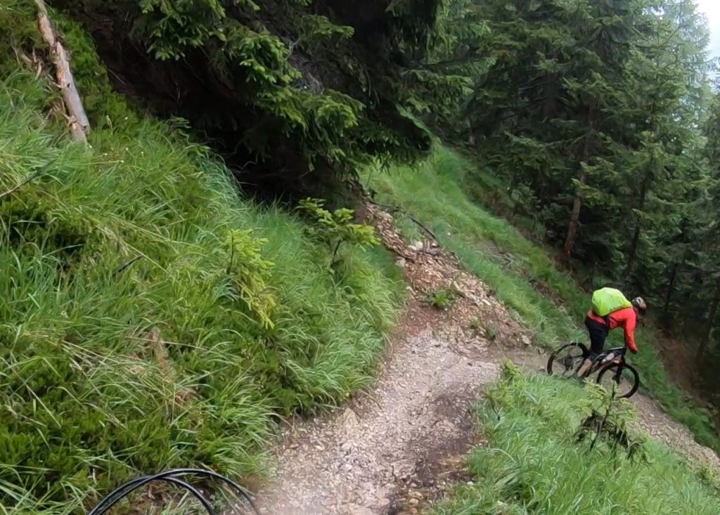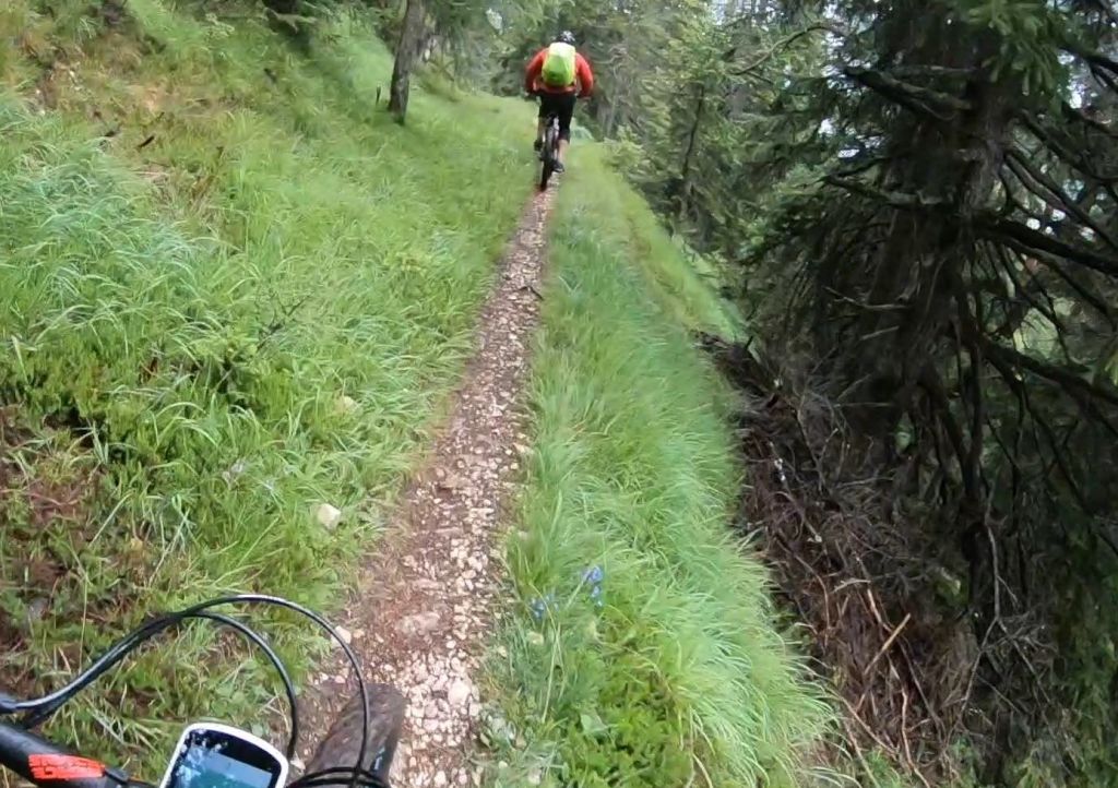 Nur ein paar Meter von hier beginnt einer der schönsten Trails, die ich je gefahren bin. In, je nach Zählweise, 22 Kehren durchquert er alle alpinen Vegetationszonen, während man 850 Höhenmeter genussvoll vernichtet. Dabei ist er von oben bis unten gut fahrbar, zählt man vereinzelte Bäume oder Felsbrocken im zum Teil etwas ausgewaschenen Pfad nicht mit.