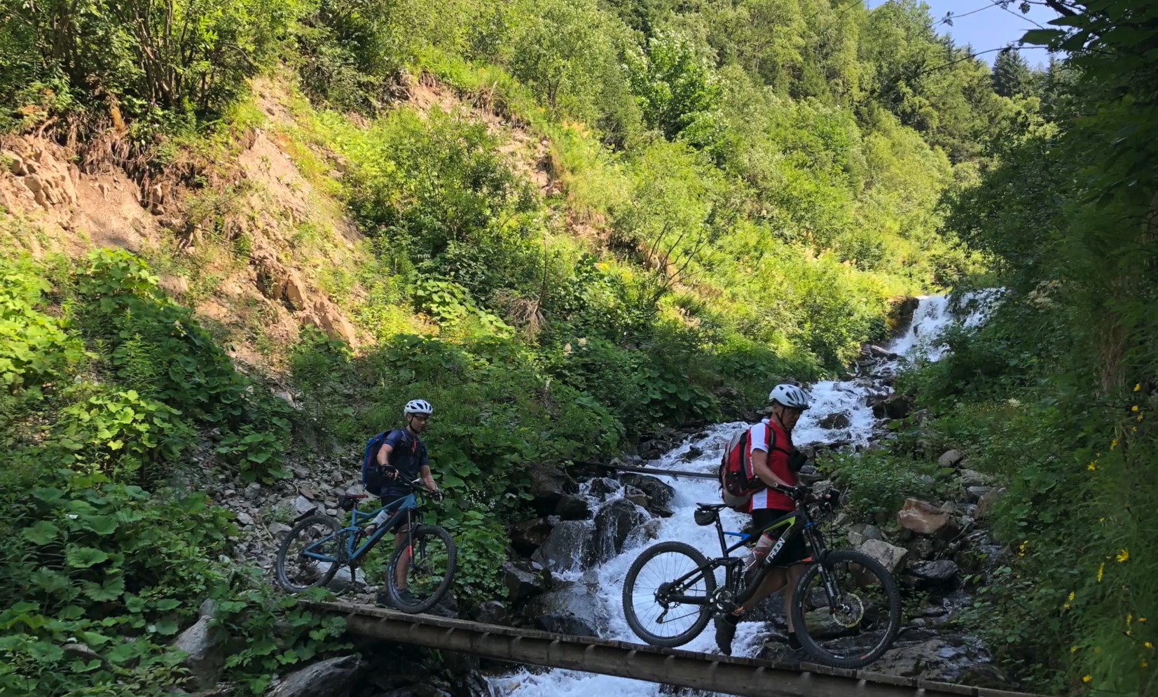 In der prallen Sonne und auf Teer gelangten wir von Landeck über Tobadill und Vorgiggl nach Giggl, wo man die Straße verlässt. Noch einmal 500 Meter auf einem schmalen Wiesenpfad und über zwei Gebirgsbäche und man hat den höchsten Punkt vor der Abfahrt auf dem Tobadill-Trail, wie er bei OSM heißt, erreicht.