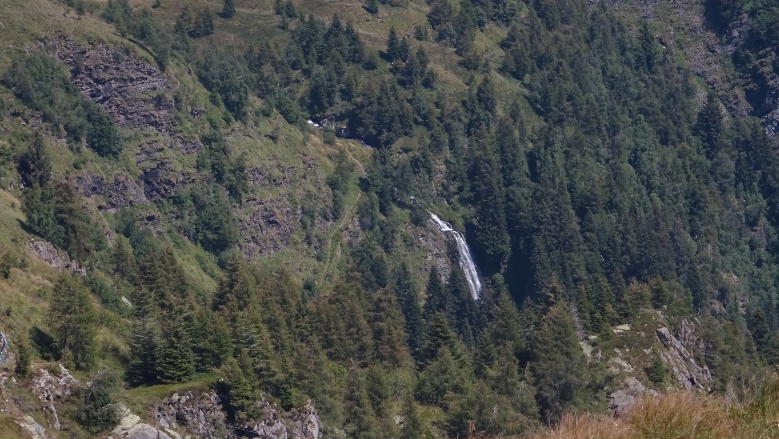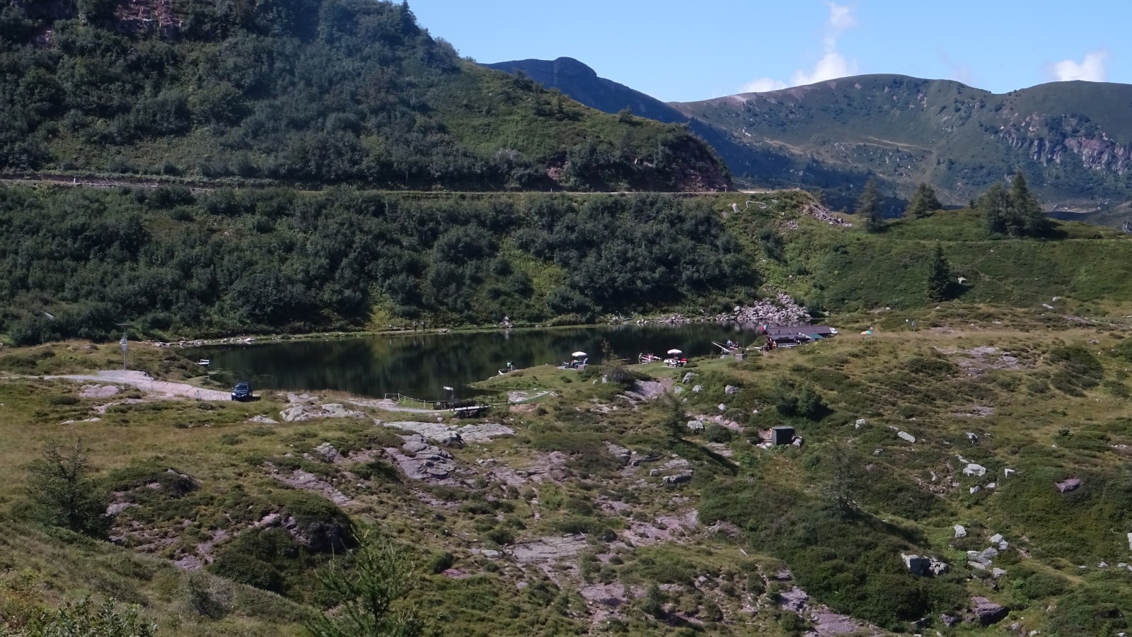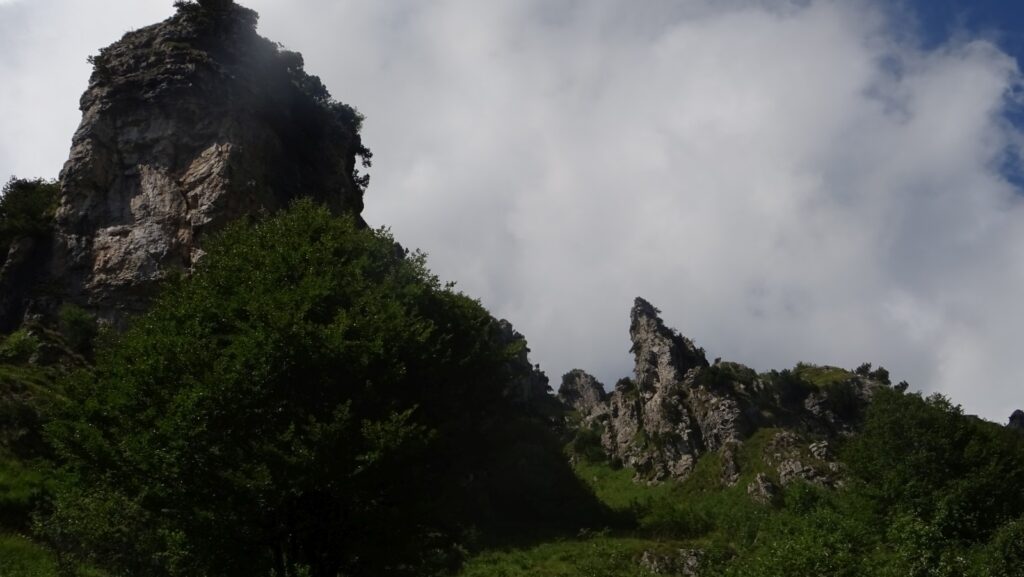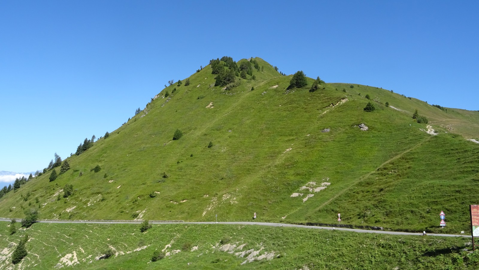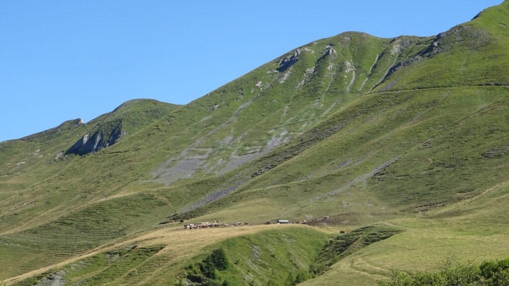 Nicht nur auf der Passhöhe ist es grün, auch die Hänge im Norden sind nicht kahl, obwohl sie sich bis auf 2200 m erheben. Der damit erzeugte Eindruck, nicht wirklich im Hochgebirge zu sein, verfliegt auch im weiteren Verlauf der Etappe nicht.