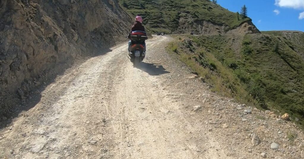 Obwohl weiterhin uneingeschränkt befahrbar, ist die Straße für die nächsten gut 5 km nicht geteert. Besonders für Motorradfahrer scheint das attraktiv zu sein.