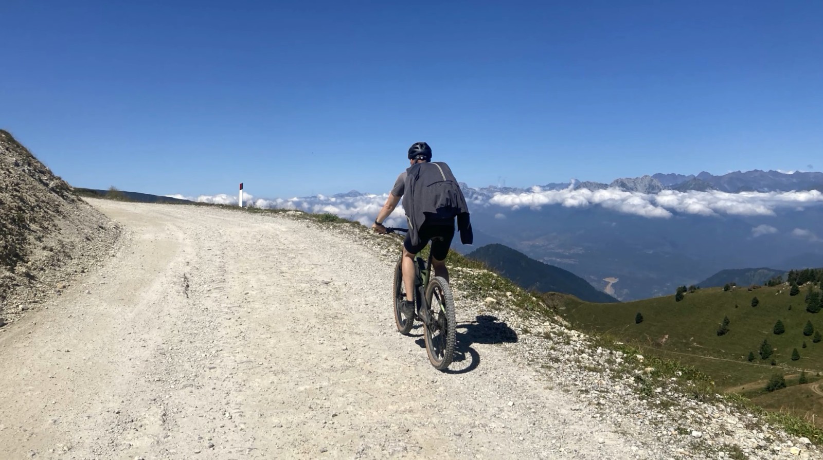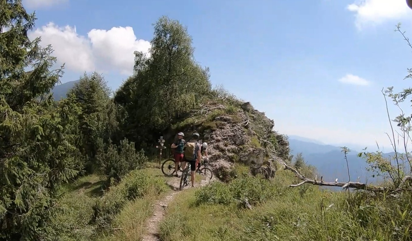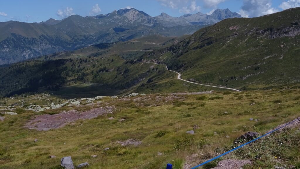 Am Dosso dei Galli hat man den höchsten Punkt bereits hinter sich gelassen. Nach einigen Wellen geht es bald ordentlich bergab, viereinhalb Kilometer weitgehend auf Teer, mit einem kurzen Abstecher über eine breite Skipiste, die einem 10 Höhenmeter und etwas Fahrspaß erspart.