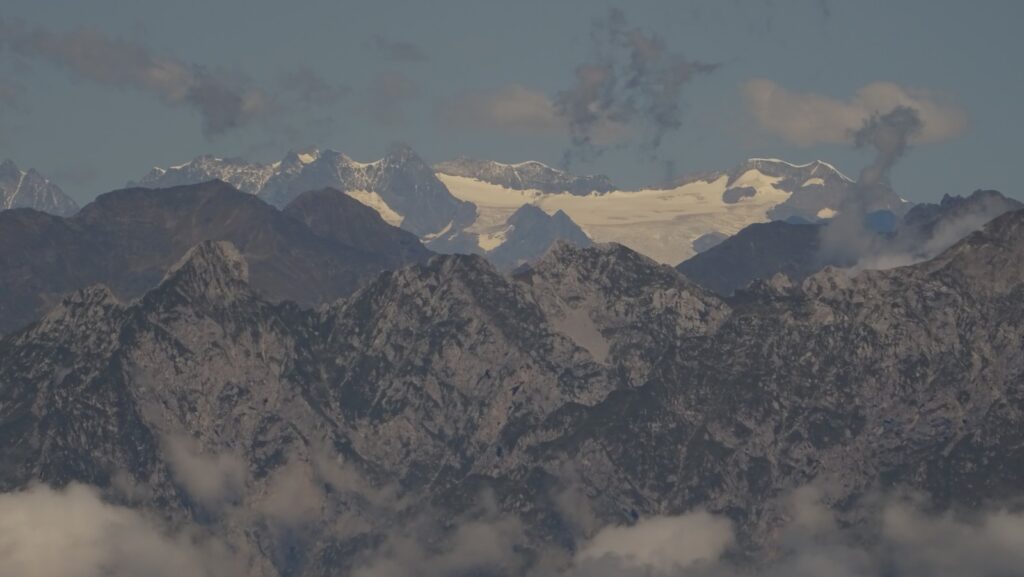 Auch die Berge im Nordwesten verdecken nicht den Blick zum Berninamassiv mit Piz Palu und Pizzo Zupó, beide an die 4000 m hoch und von mächtigen Gletschern umsäumt.