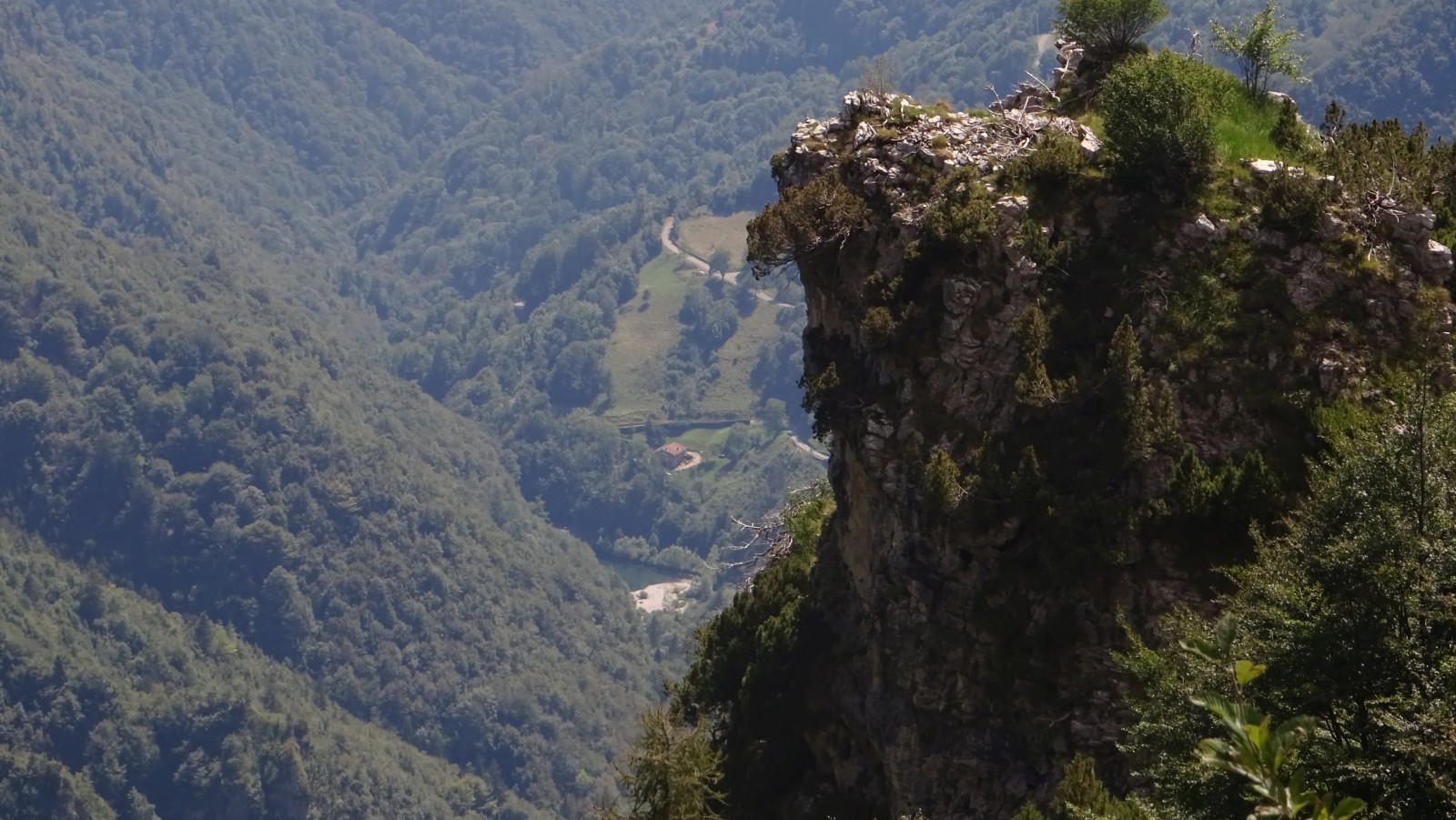Unmittelbar unterhalb der Straße sieht man schroffe Felszähne, auf denen sich schmächtige Kiefern festhalten und mit dem Stein zusammen der Schwerkraft trotzen.