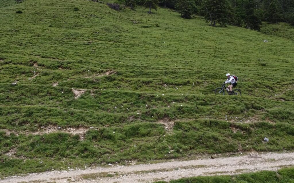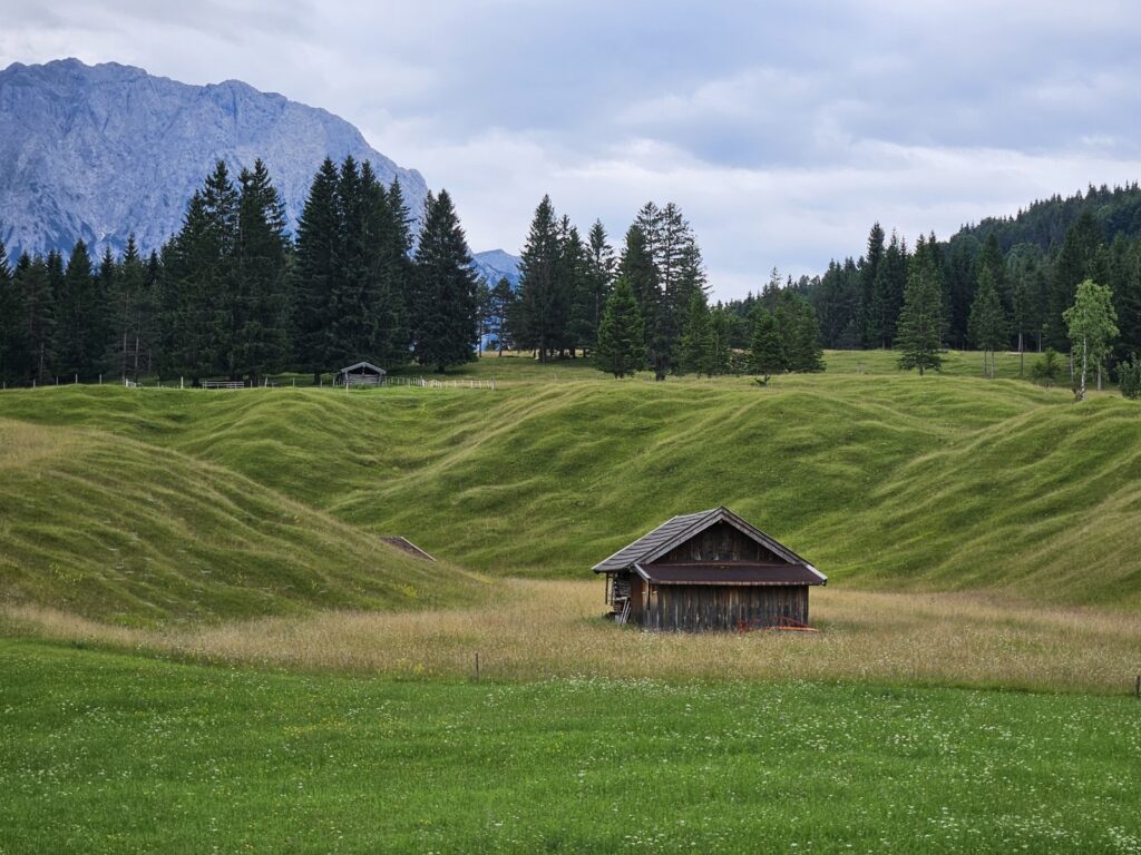 Etwas Landschaft, der kaum befahrbare und erfreulich kurze Römerweg und saftige grüne Buckelwiesen rechtfertigen einige zusätzliche Höhenmeter und verkürzen die Fahrstrecke auf der Landstraße nach Mittenwald.