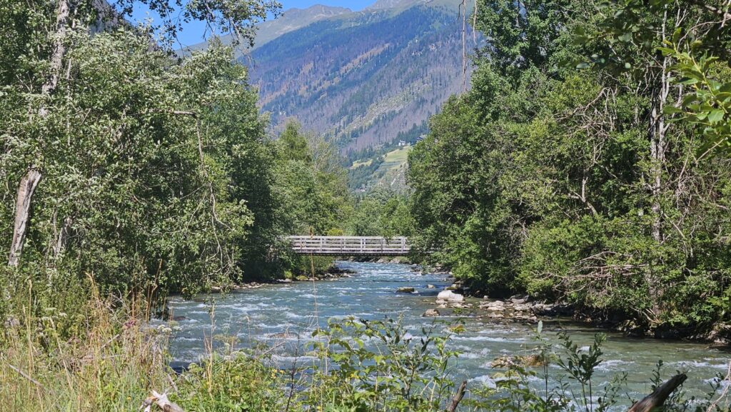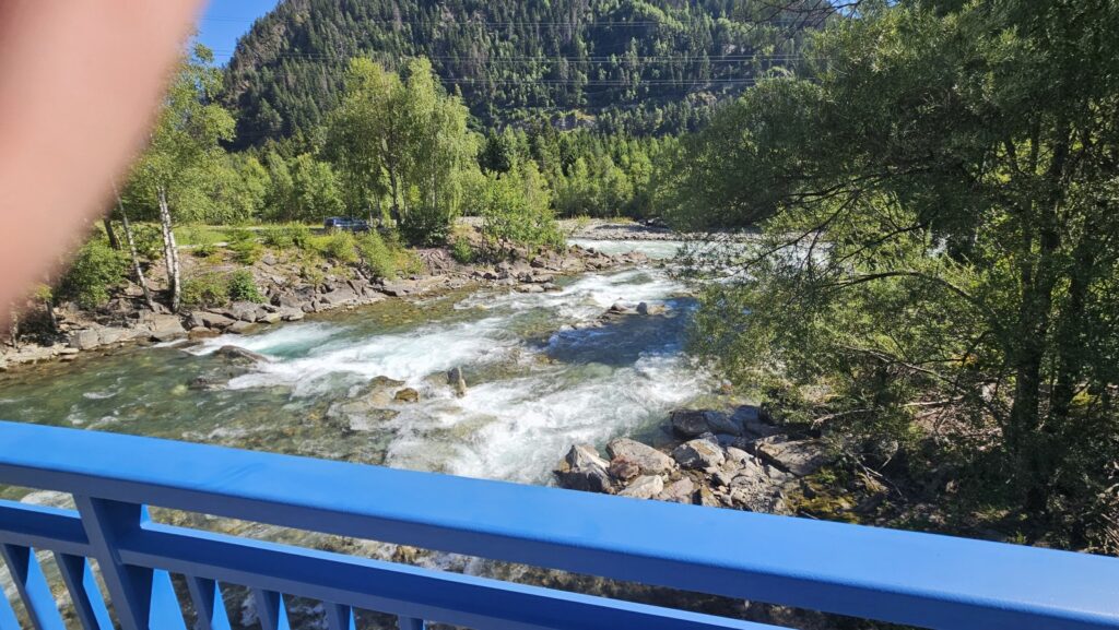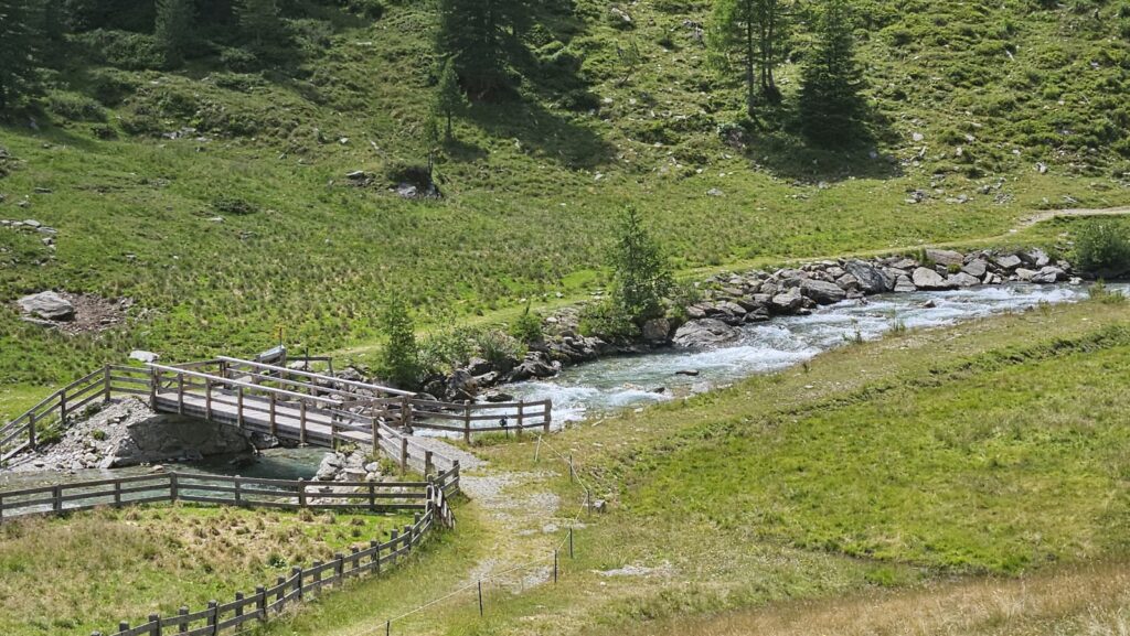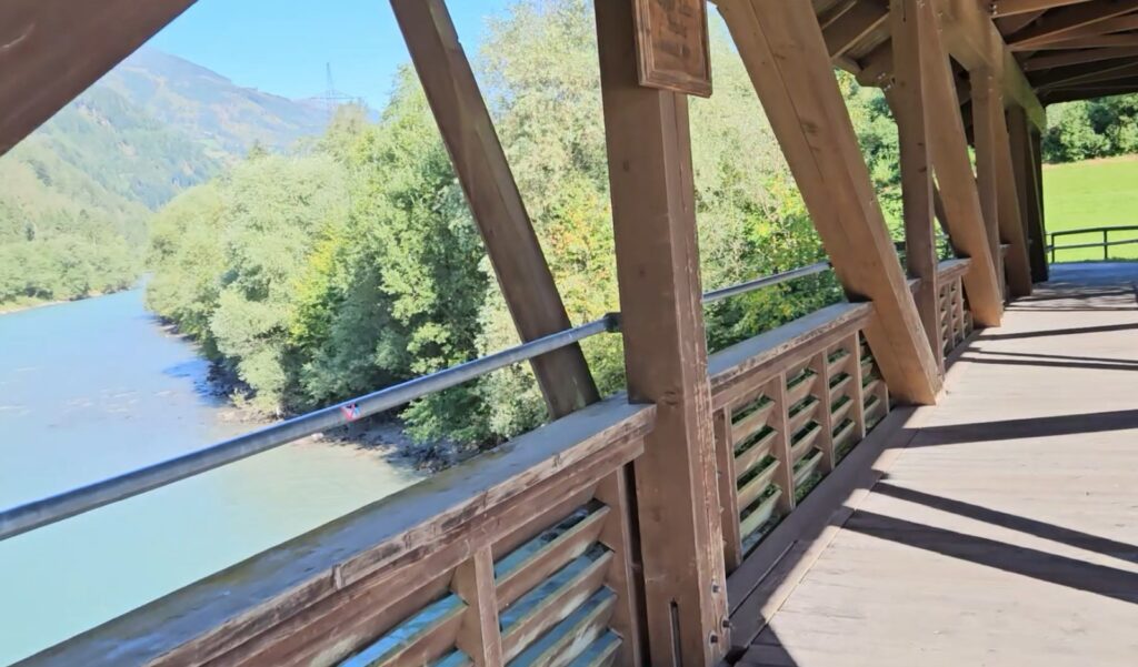 Vor Lienz führt ein Steg über die Drau, die hier von Süden kommt und scheinbar in die von Westen her fließende Isel mündet.