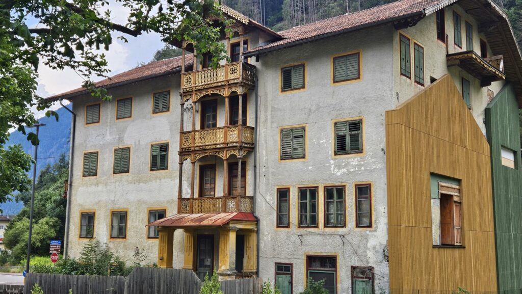Kurz vor Huben gibt es links der Straße die Burgruine Kienburg zu sehen. Der eigentliche Blickfang ist aber das Haus unterhalb der Ruine: Fast vollständig von Wein oder Efeu bedeckt, würde man es übersehen, wenn nicht die Fenster und die weißen Schornsteine es verrieten.