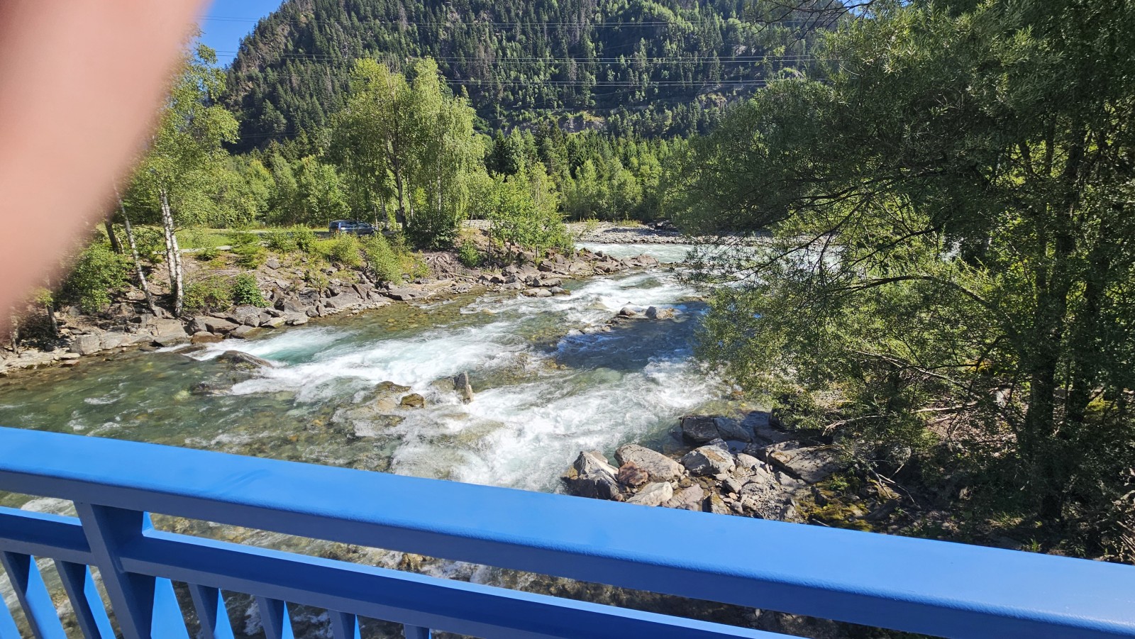 Vor Lienz führt ein Steg über die Drau, die hier von Süden kommt und scheinbar in die von Westen her fließende Isel mündet.