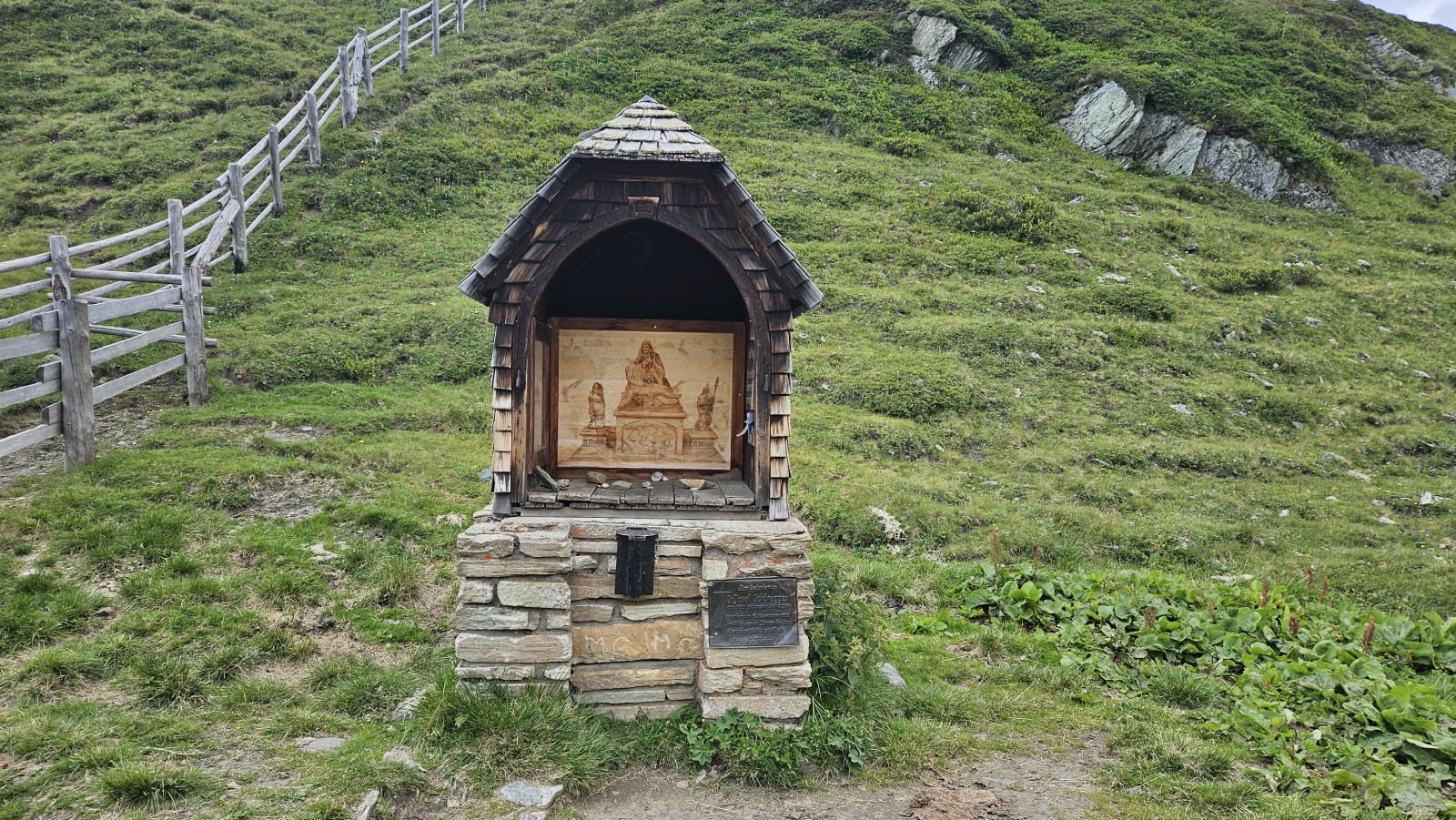 Ein Schnappschuss von der winzigen Holzhütte und dem Schrein für einen Arzt, der hier bei der Gamsjagd das Leben ließ und ich machte mich auch auf den Weg.