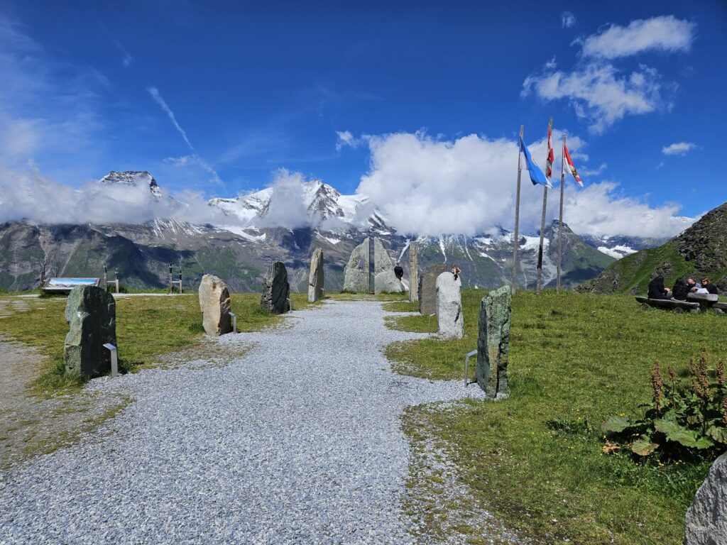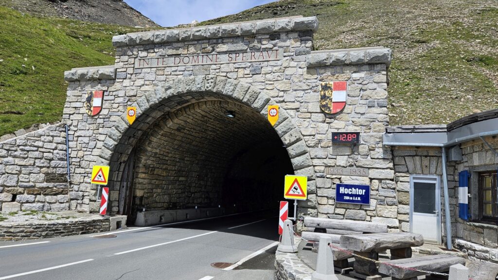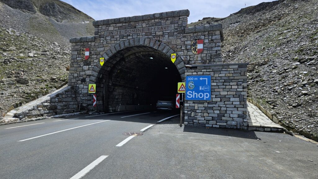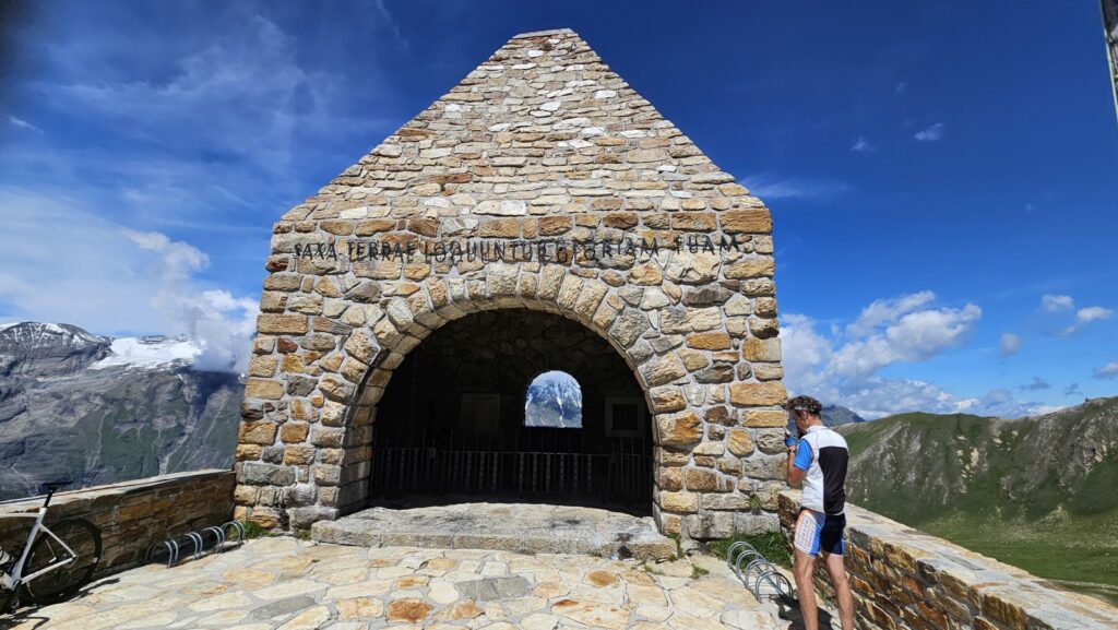 Am höchsten Punkt, meiner ersten Bergwertung des Tages, höchste Kategorie, hat man zu Ehren der Erbauer und besonders der Opfer der Großglocknerhochalpenstraße ein Denkmal errichtet. Die Inschrift, zu deutsch „Die Steine der Erde verkünden deinen Ruhm“, muss die Nazis wohl gestört haben. Während ihrer 1000jährigen Herrschaft über Österreich wurde sie durch „Diese herrliche Bergwelt brachte ÖSTERREICH dem deutschen Vaterlande am 13. März 1938 als MORGENGABE mit“, ersetzt. (Salzburg-Wiki)